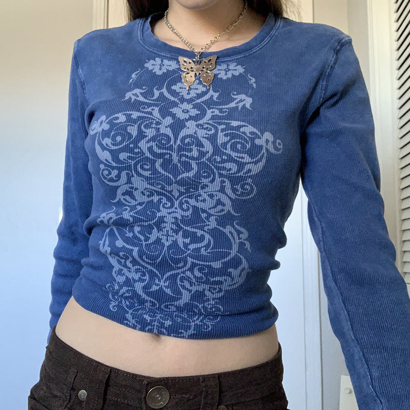 Ins American Retro Style Print Round Neck Slim Long Sleeves